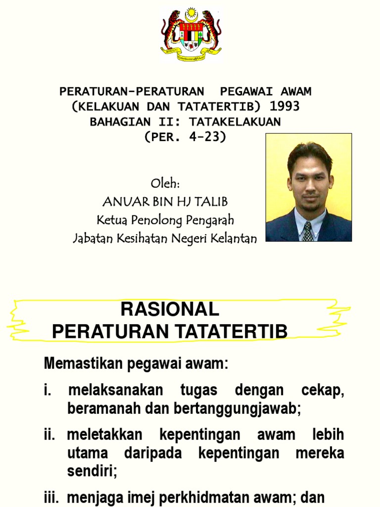Peraturan-Peraturan Pegawai Awam (Kelakuan Dan Tatatertib) 1993 - Peraturan Peraturan Pegawai Awam Kelakuan Dan Tatatertib 1993 : Walau bagaimanapun dari segi perundangan nama. Jabatan perkhidmatan awam malaysia (jpa) sukacita memaklumkan beberapa perkara yang berkaitan pengurusan tatatertib dalam perkhidmatan awam seperti berikut: (a)395/1993] seksyen 18, akta prosedur kewangan 1957. Peraturan ini kemudiannya telah dipinda beberapa kali. Asante a/p sanderasaidar suganthamalar a/p ratnam pengenalan peraturan kelakuan tatatertib adalah satu bentuk kawalan ke atas semua penjawat awam untuk menjamin keberkesanan sesuatu organisasi. Ramdani bahagian sumber manusia, jabatan pendaftar (kkl) kenapa kenapa diwujudkan peraturan tatatertib?